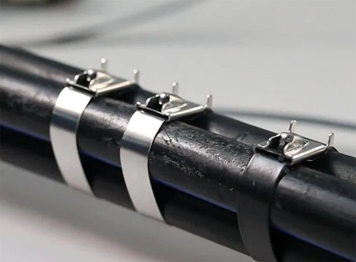 Изделие представляет собой довольно простую конструкцию, представленную в виде стальной ленты и крепления, с помощью которого можно зажимать хомут при достижении нужного диаметра. Основной элемент – сплошная лента с накаткой без резьбы на внутренней части. За счет гладкой внутренней поверхности стальной ленты обеспечивается максимально оптимальное усилие обжима без разрушения поверхности фиксируемого шланга. Одноразовый зажим выполняется за счет шарикового механизма.
