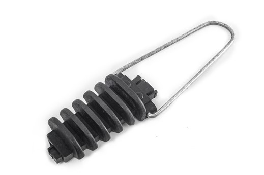 Натяжной зажим состоит из корпуса с оребренной контактной поверхностью, клина и вставки, которая прокладывается между кабелем и клином. Конструкция зажима имеет разъемную петлю.