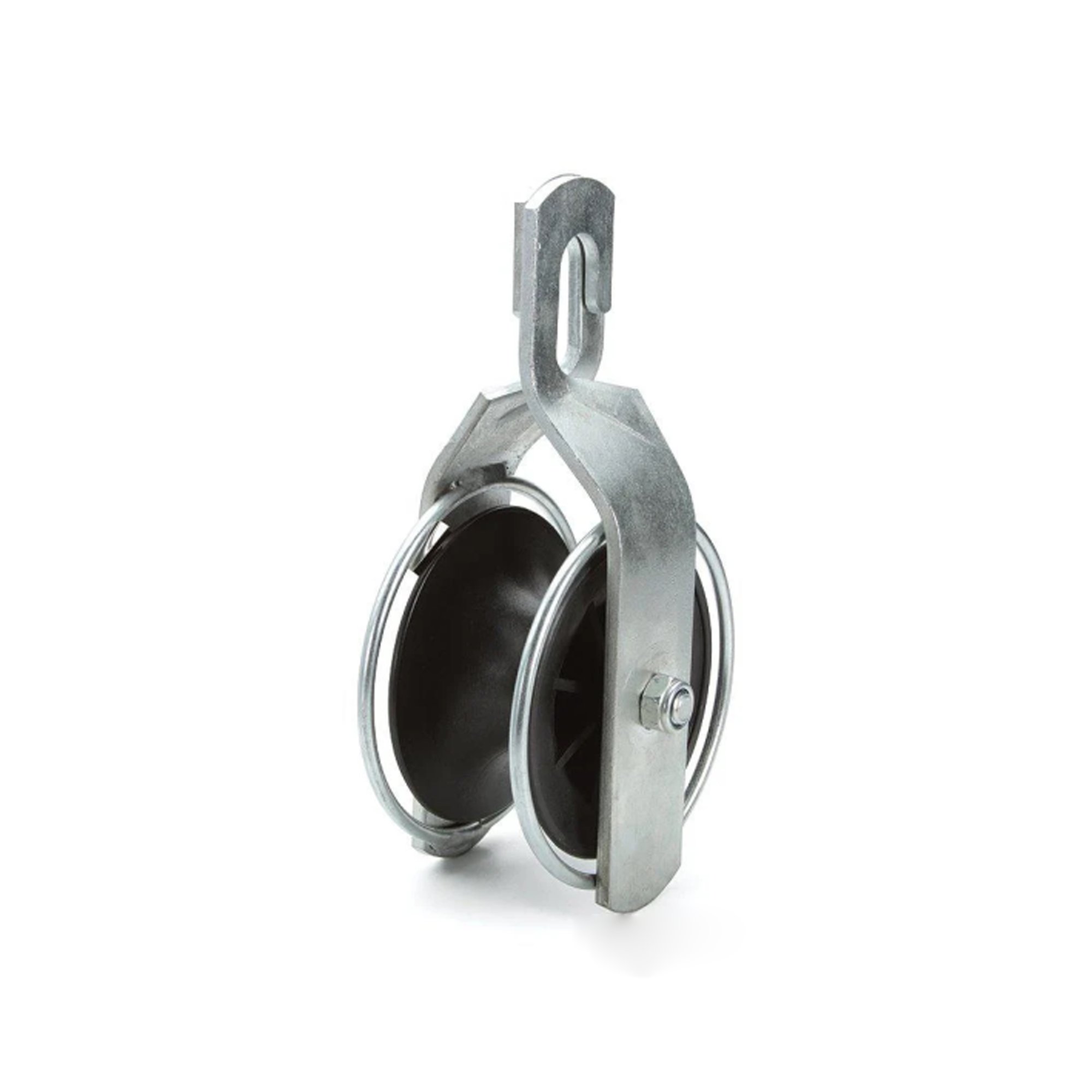 Ролик выполнен из крепкой металлической конструкции, состоящей из двух щёк, между которыми на оси установлен пластмассовый рабочий ролик. При совмещении двух подвижных щёк образуется общая проушина с отверстием, предназначенная для навешивания ролика на крюк или кронштейн.