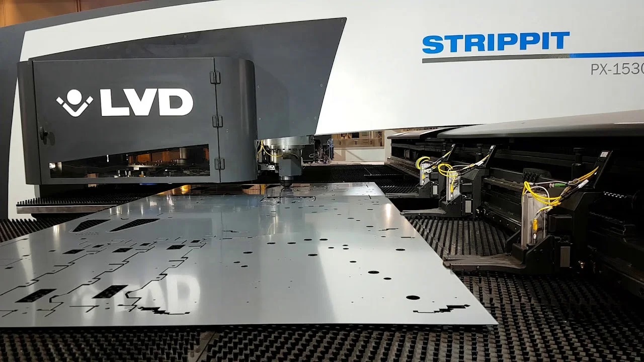 Данный станок является высокоскоростным (Скорость пробивки металла достигает до 1200ударов в минуту). Так же этот станок является полноформатным, то есть позволяет обрабатывать металлический лист размером 2500х1250мм без перехвата. А с перехватом размер обработки может быть увеличен до 5000х1250мм. Возможность использования роликового и формовочного инструмена выгодно отличает координатную пробивку от лазерной резки в диапазонах толщин материала от 0,5-3,0мм.